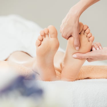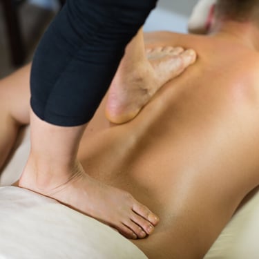 A deep, broad-pressure technique where the therapist uses their feet to apply controlled pressure to release tight muscles and improve mobility. Excellent for clients who enjoy strong, even pressure.